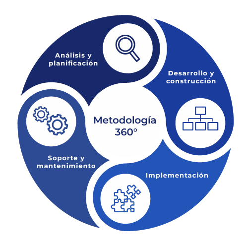 Nuestro enfoque integral 360 abarca la sincronía de personas, procesos y tecnología. Desde la identificación y análisis de necesidades hasta la implementación y soporte continuo, asegurando que cada proyecto se ejecute con precisión, eficiencia y seguridad.